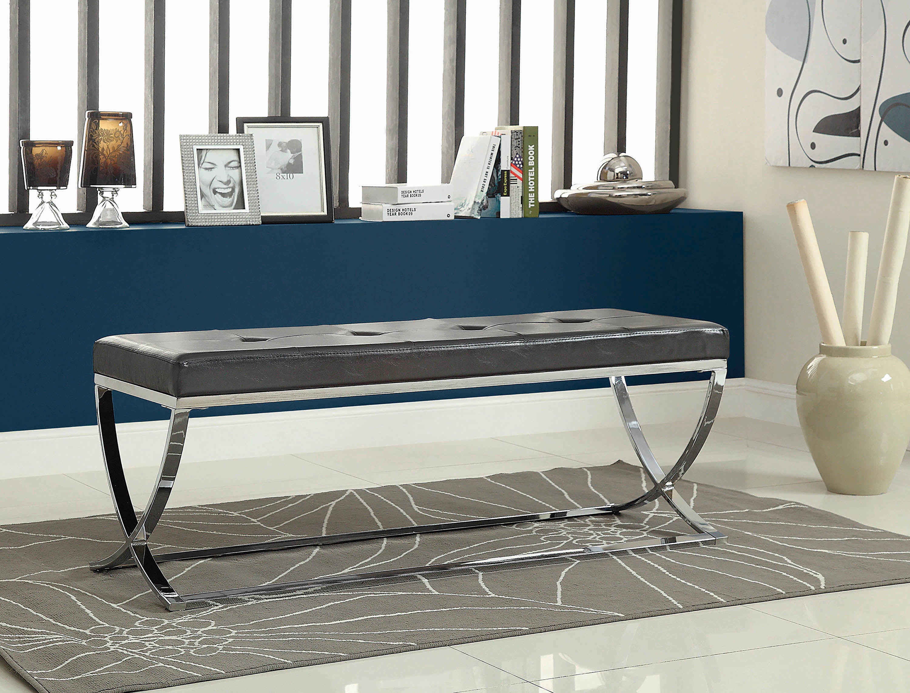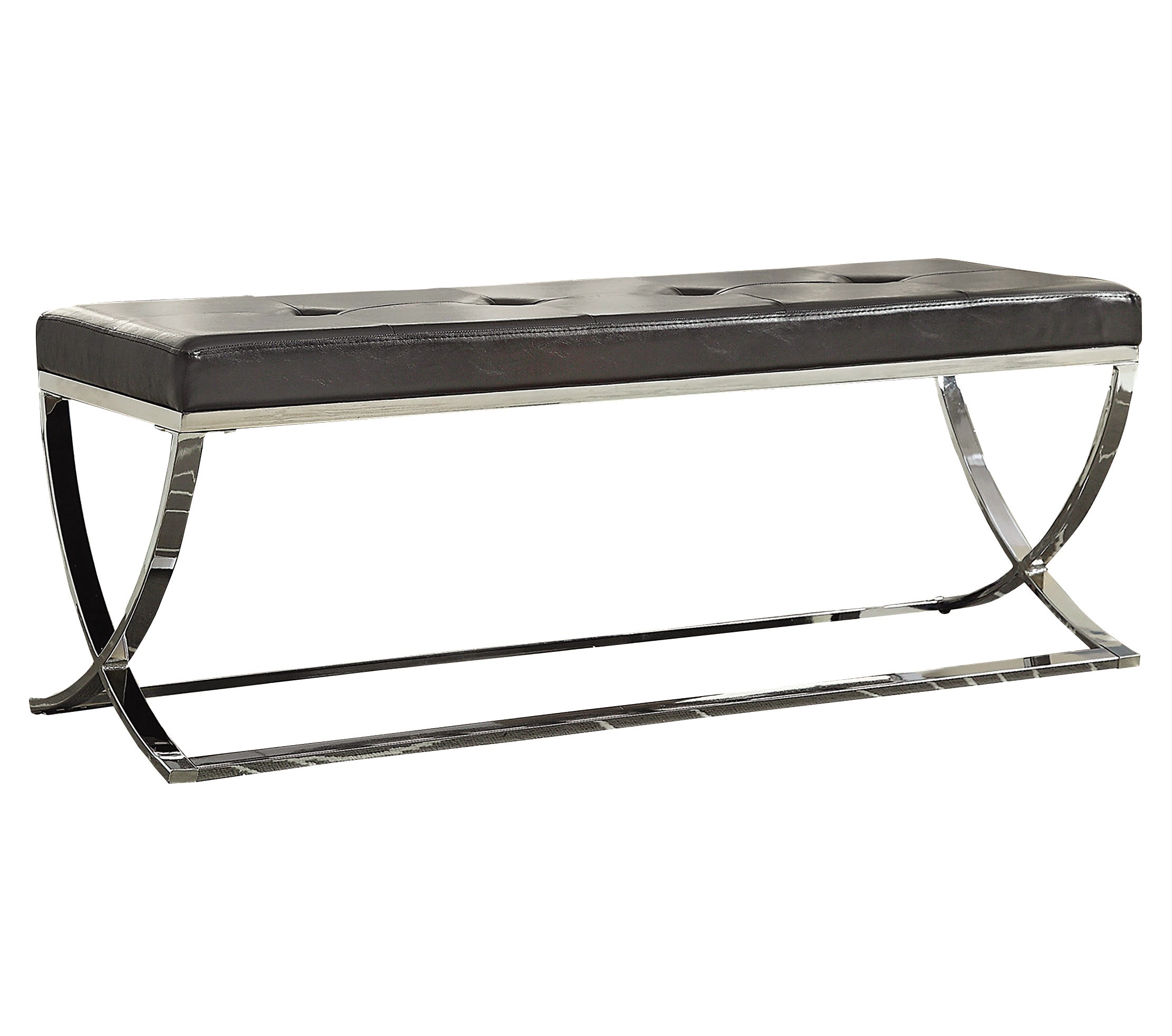 Adéntrese en un nuevo estilo de diseño contemporáneo. Con una silueta esbelta, este elegante banco ofrece las ventajas de un mobiliario de exterior y la estética de una decoración con toques de distinción. Su estilo minimalista contrasta con los detalles ornamentales de un perfil que combina suaves contornos en su estructura cromada con una elegante superficie revestida en polipiel negra. El acolchado justo proporciona una comodidad óptima y una apariencia elegante. El capitoné decorativo completa las sofisticadas características que convierten a este banco en una opción ideal para modernizar una sala de estar o de estar moderna.