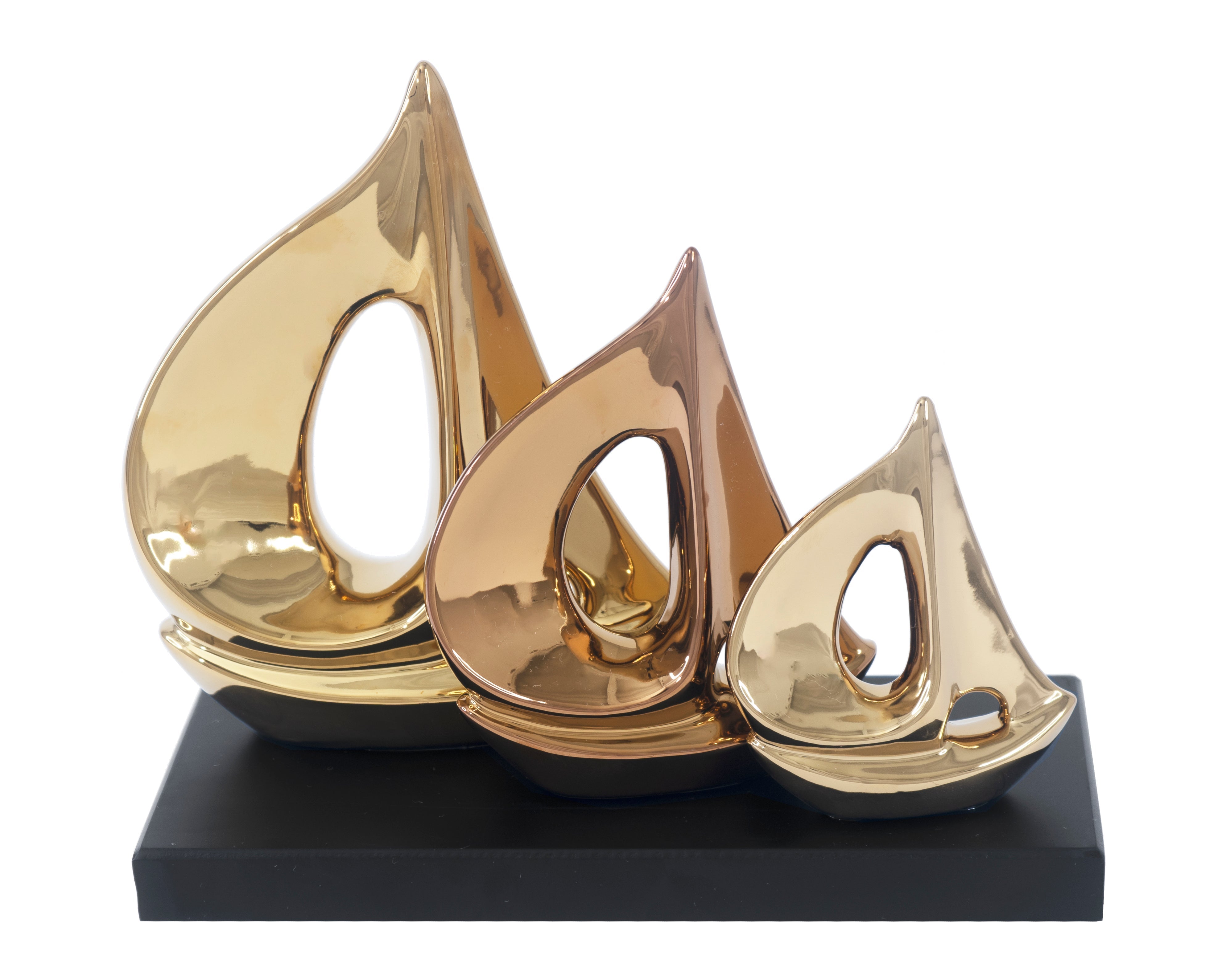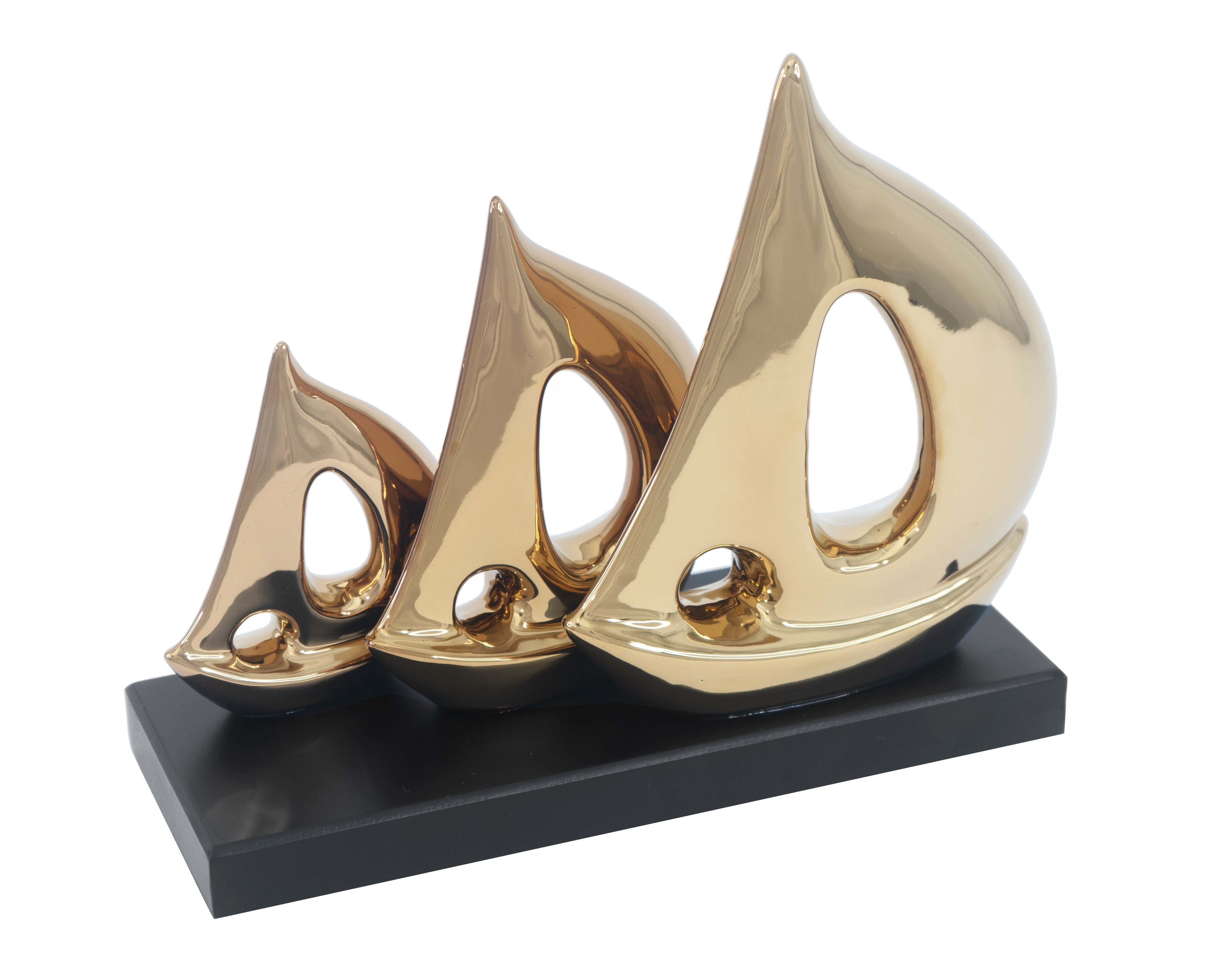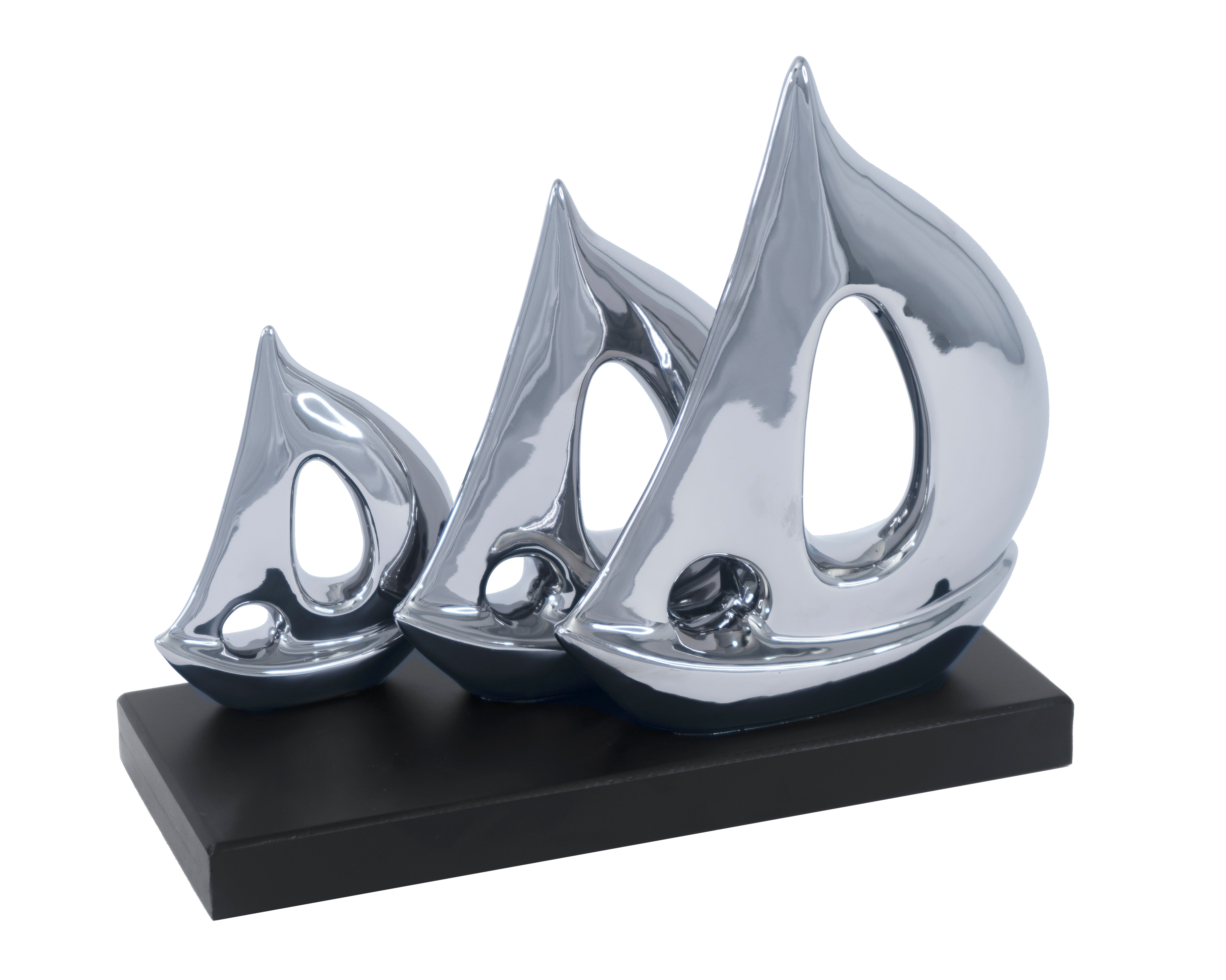 ¡Prepárate para zarpar con esta fantástica escultura de barco de cerámica que transformará cualquier rincón! Sus tres veleros metálicos pulidos, de diferentes tamaños, se asientan majestuosamente sobre una base de madera oscura. Esta pieza abstracta, inspirada en la costa, infunde una vibra serena y relajante en tu hogar. Es el toque perfecto para tu estantería, oficina o mesa de centro, añadiendo un encanto náutico sin igual.