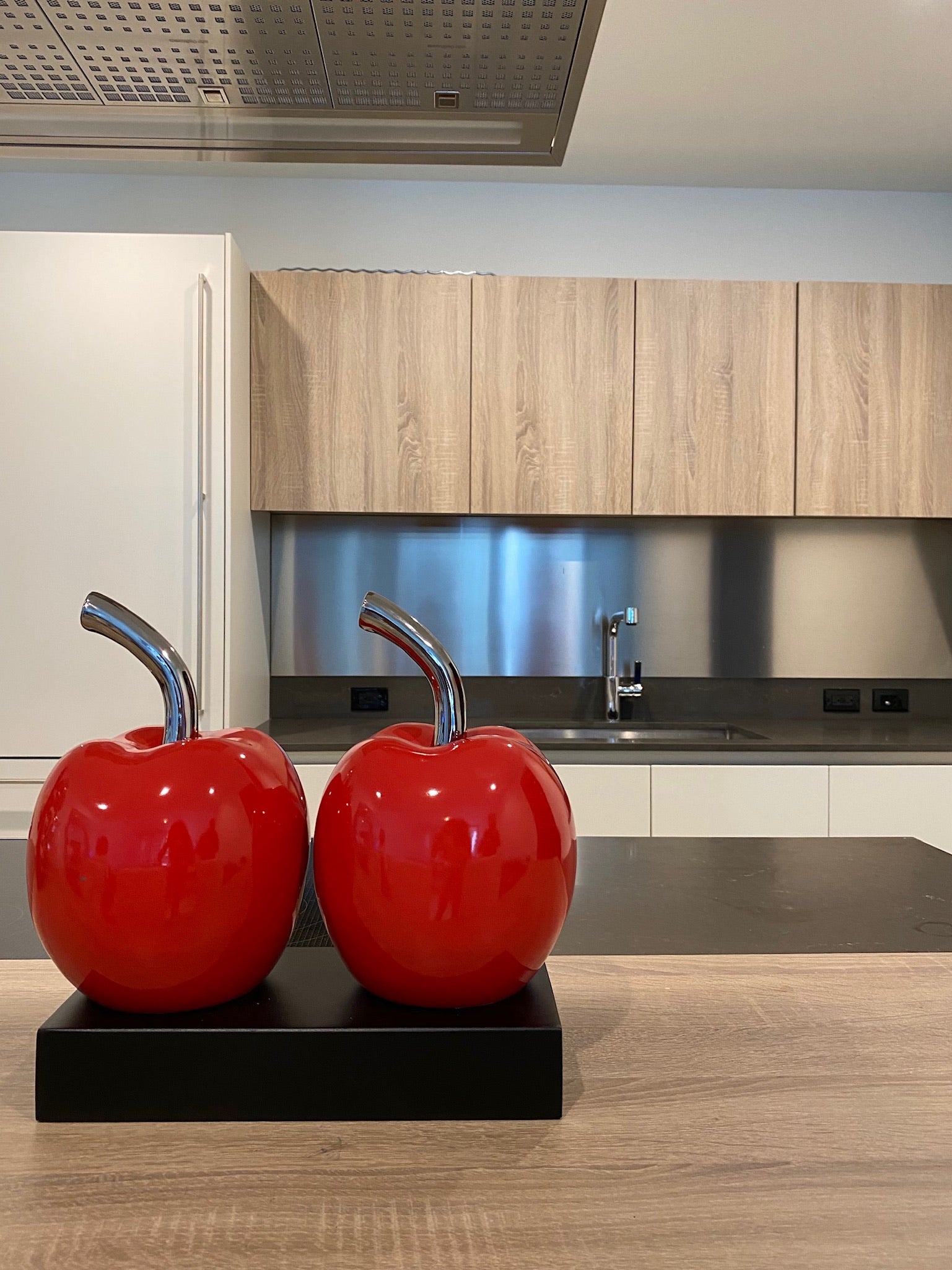 Añade un toque divertido y vibrante a tu espacio con esta encantadora escultura de manzanas dobles. Hecha con cerámica de alta calidad y un acabado rojo brillante, es la pieza perfecta para alegrar cualquier hogar o aula. Su diseño moderno sobre una base cuadrada negra la convierte en un punto focal único. ¡Dale a tu decoración un giro fresco y juguetón con esta pieza excepcional!