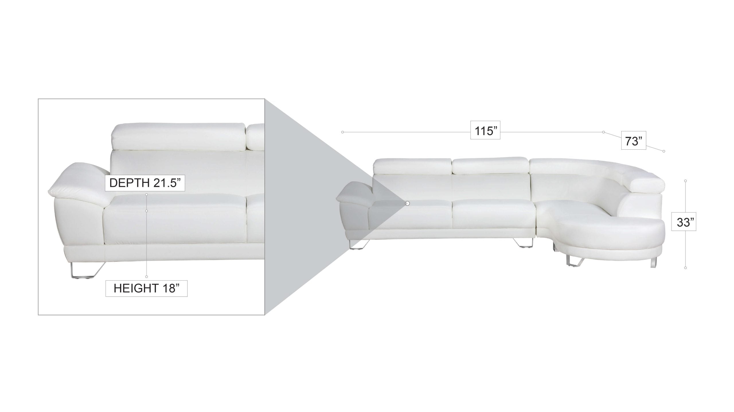 Disfruta de la comodidad suprema con el sofá seccional Almira, un verdadero campeón del descanso. Su estructura de madera maciza y patas cromadas le dan un toque de elegancia que te encantará. Los asientos de espuma de alta densidad (1.9) te abrazarán con un soporte excepcional, mientras que el cabecero ajustable te permite encontrar tu posición perfecta. Crea momentos inolvidables de relax en este oasis de piel ecológica.