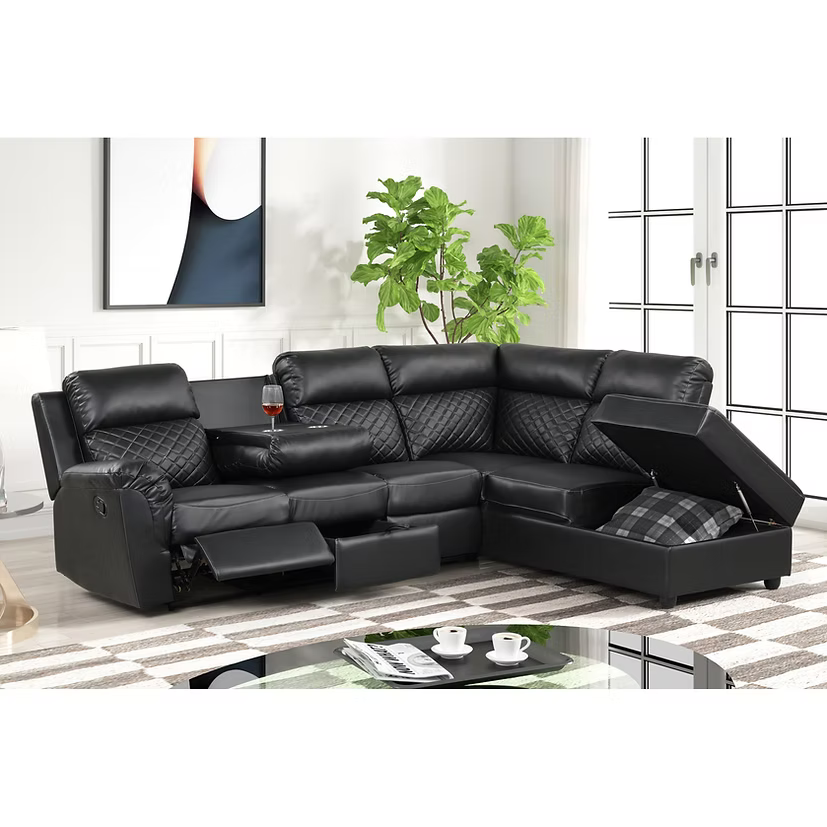 - Give your home decor a modern contemporary charm with this elegant and luxurious reclining sectional. This provides excellent comfort with faux Leather upholstery, pillow-top backrest and armrests, and pocket coil spring seat cushion covered with premium foam which offers more comfort. This profoundly indulgent sectional features a one manual reclining mechanism. At its center, you have a built-in console that has two cup holders. You can fold and turn it into a seat when you need to accommodate more people in your living room. That adds to the utility of this phenomenal piece of furniture. To add to that, you get additional storage underneath the center console and side seat as shown in the picture. The interior frame is crafted from solid hardwood and the manually operated reclining mechanism in one seat offers a metal construction that's designed for years of reliable use. Ease back into the deep seating to rest your head on the supportive headrest. Supple fabric gives your room the high-end look of leather with a spicy pop of color. Color options: Black, Gray, Brown & Ice (White). You'll love how easy it is to recline in infinite positions of relaxation. This will be the best choice for your living room decoration. Host movie nights with family or sit back in style with this living room comfortable sectional.